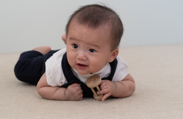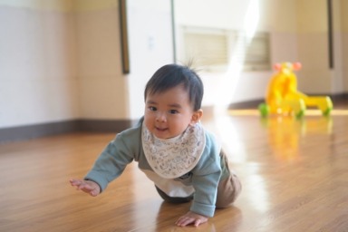 仰向けで手足を動かし、寝返りを覚え、床を這い、ハイハイをします。